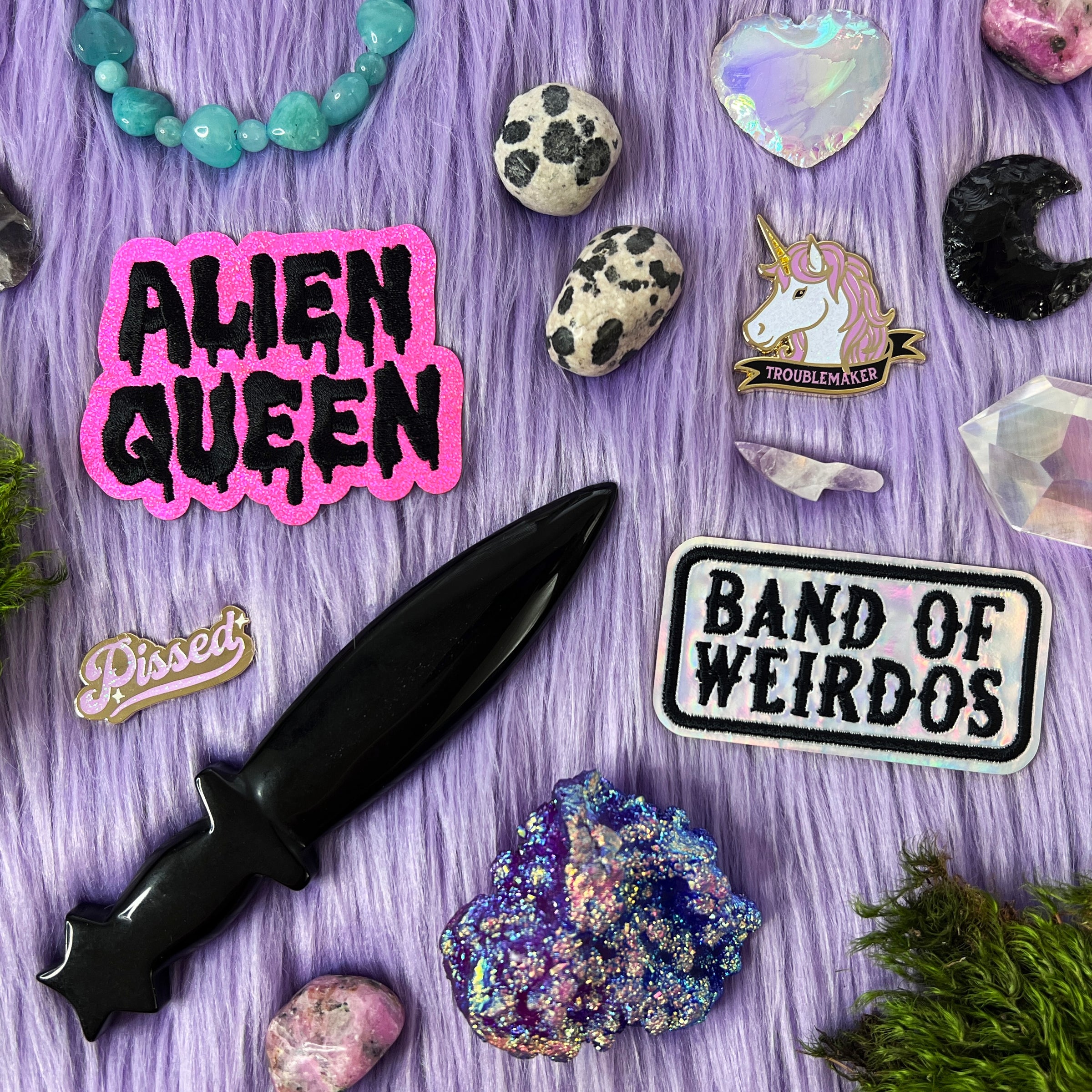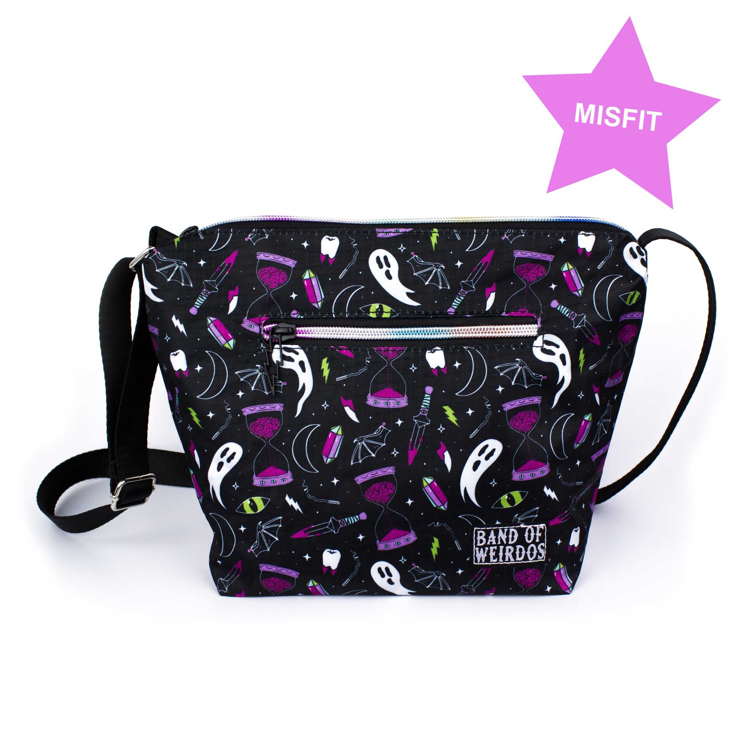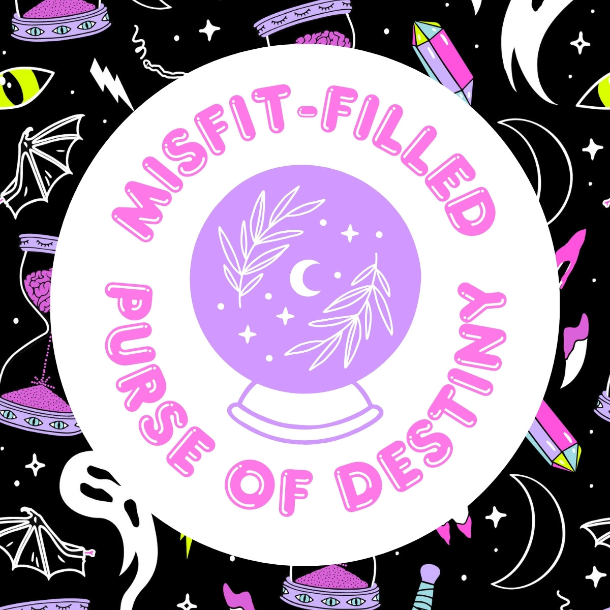 You are guaranteed to receive a misfit "Midnight" themed purse, and it'll be filled with a random assortment of items! You may or may not receive: